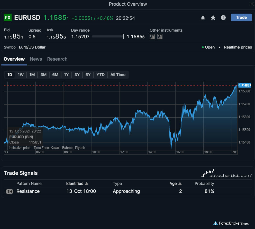 Yes, the best forex brokers offer access to high-quality free forex signals, usually available within their platform or through a dedicated website. For example, IG directly integrates PIA First and Autochartist within its web-based trading platform. One thing about IG’s integration of trading signals that I appreciate is the ability to copy a trading signal directly into a trade ticket. This feature (which is offered by other top brokers, such as Saxo) allows you to place an order without having to type in every detail, providing a smooth user experience.