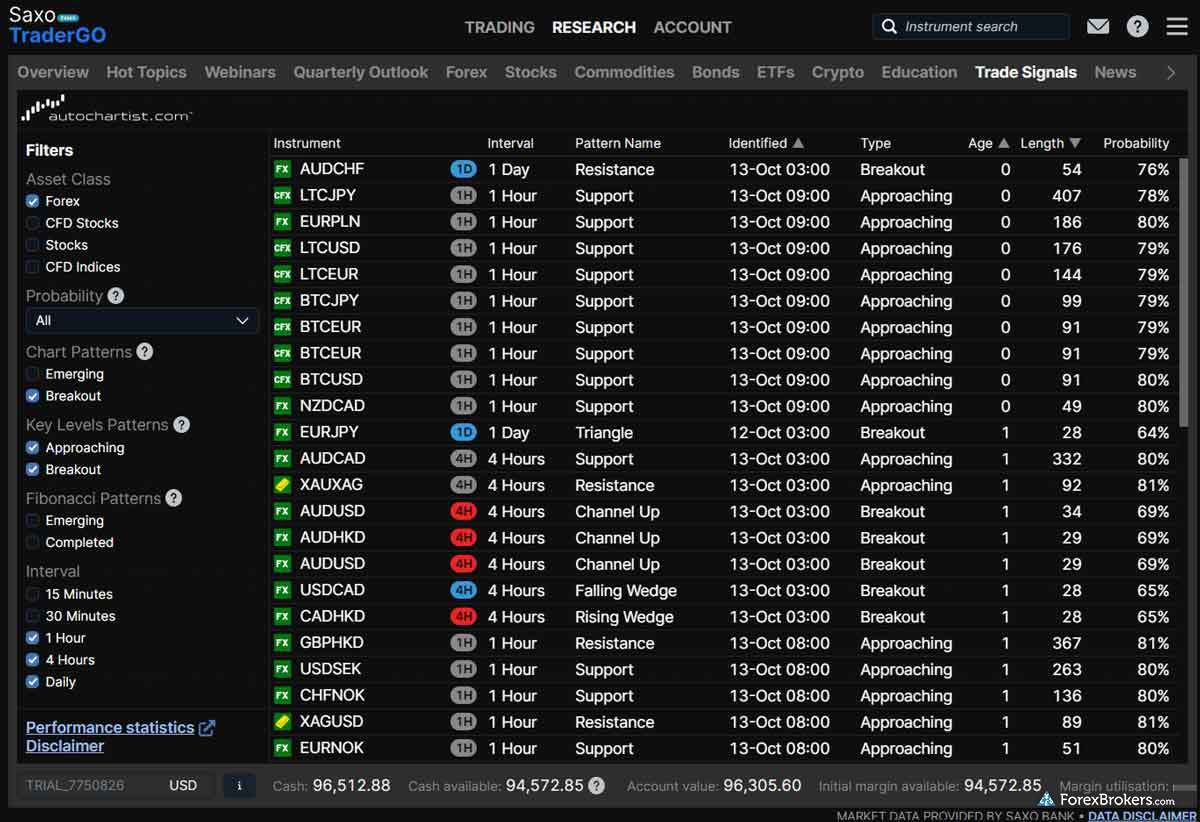 Autochartist: Historically, Autocharist was offered as a plugin or on a standalone basis, but brokers like Saxo have fully integrated Autochartist into the platform experience via API, blurring the lines between third-party service and native integrated feature. Saxo’s choice to fully integrate this popular signals provider effectively lowers the barrier for entry for traders who are looking to access trading signals. I’m a big fan of Saxo’s integration and I’ve been a longtime fan of its award-winning platform suite, which includes the SaxoTraderGO app for web and mobile and the SaxoTraderPRO desktop platform.