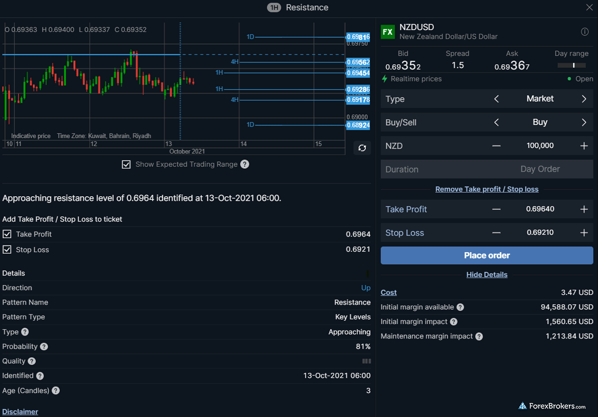 Trading signals analysis: There are a few standout features offered by Saxo that I appreciate — including its screener which lists high-level signal parameters for each signal generated across asset classes, as well as the ability to analyze the signal in greater detail and copy it to the trade ticket window integrated into the preview screen. Standout features include being able to toggle the expected trading range to get an idea of the future price expectation, and quickly copy the details into the integrated order window. The signal is automatically copied to the trade ticket window, and you have the option to tick a checkmark box to add a take profit and stop-loss to the order.